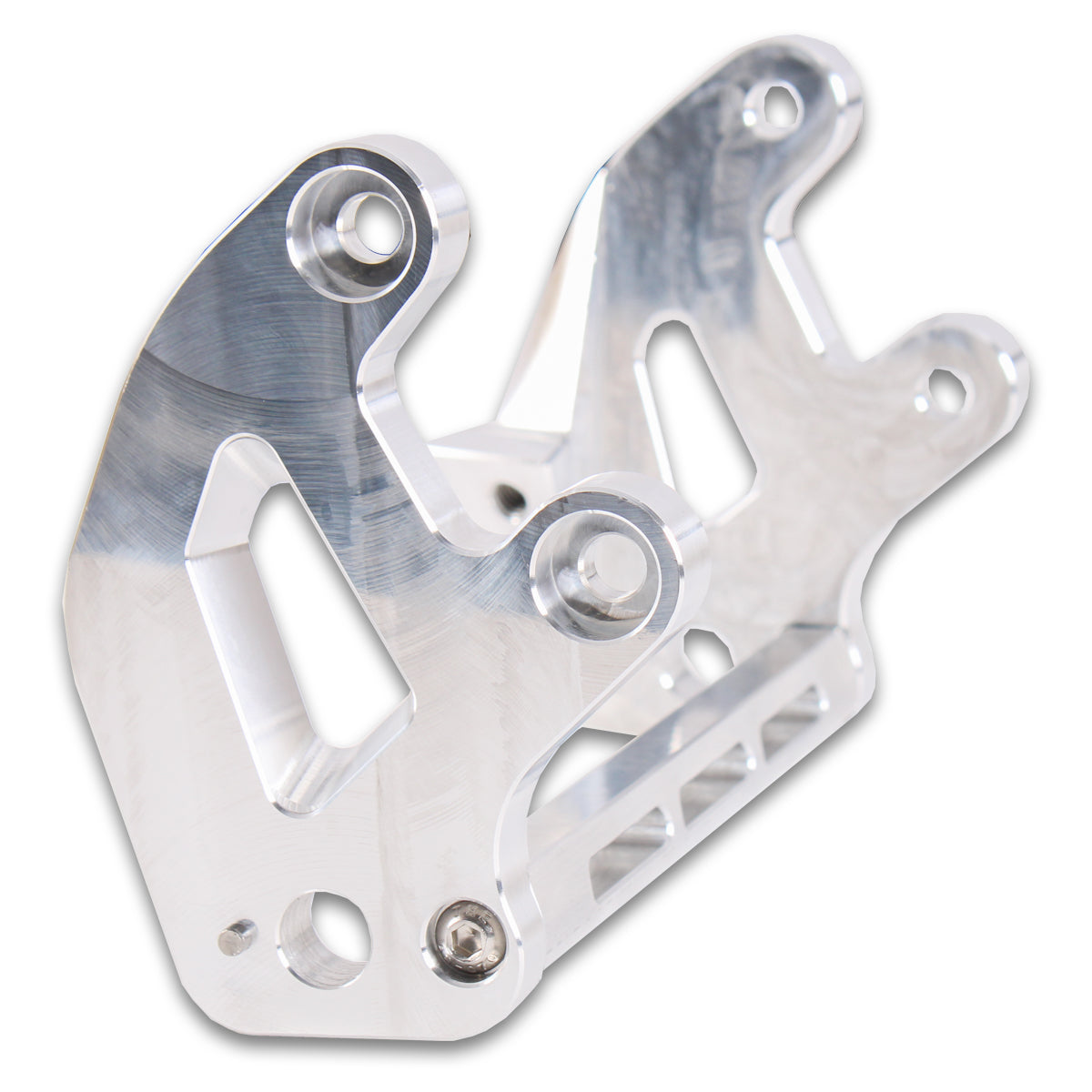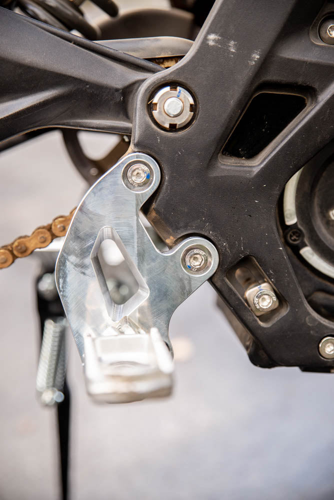 Direct replacement Sur Ron peg brackets 20mm lower than stock geometry. This setup accommodates longer legs as well as a lower center of gravity. 5-axis machined from solid 6061 billet aluminum. Replaces weak stock cast aluminum brackets. Pair includes matching left and right brackets along with a brace for added strength. Strong 0.5” bracket thickness will not bend or fail.