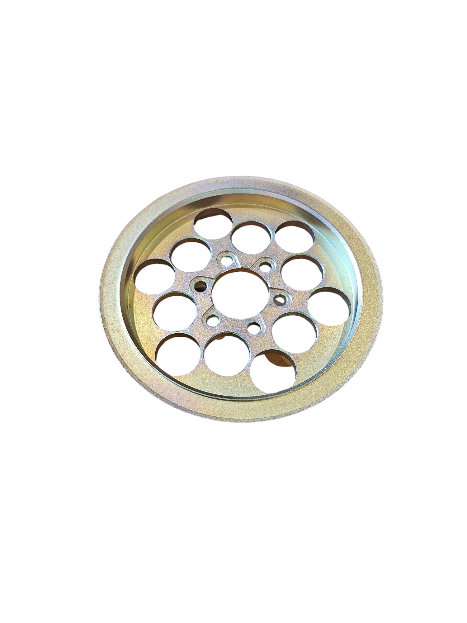 45# Steel, these will not wear like the traditional cast aluminum pulley.